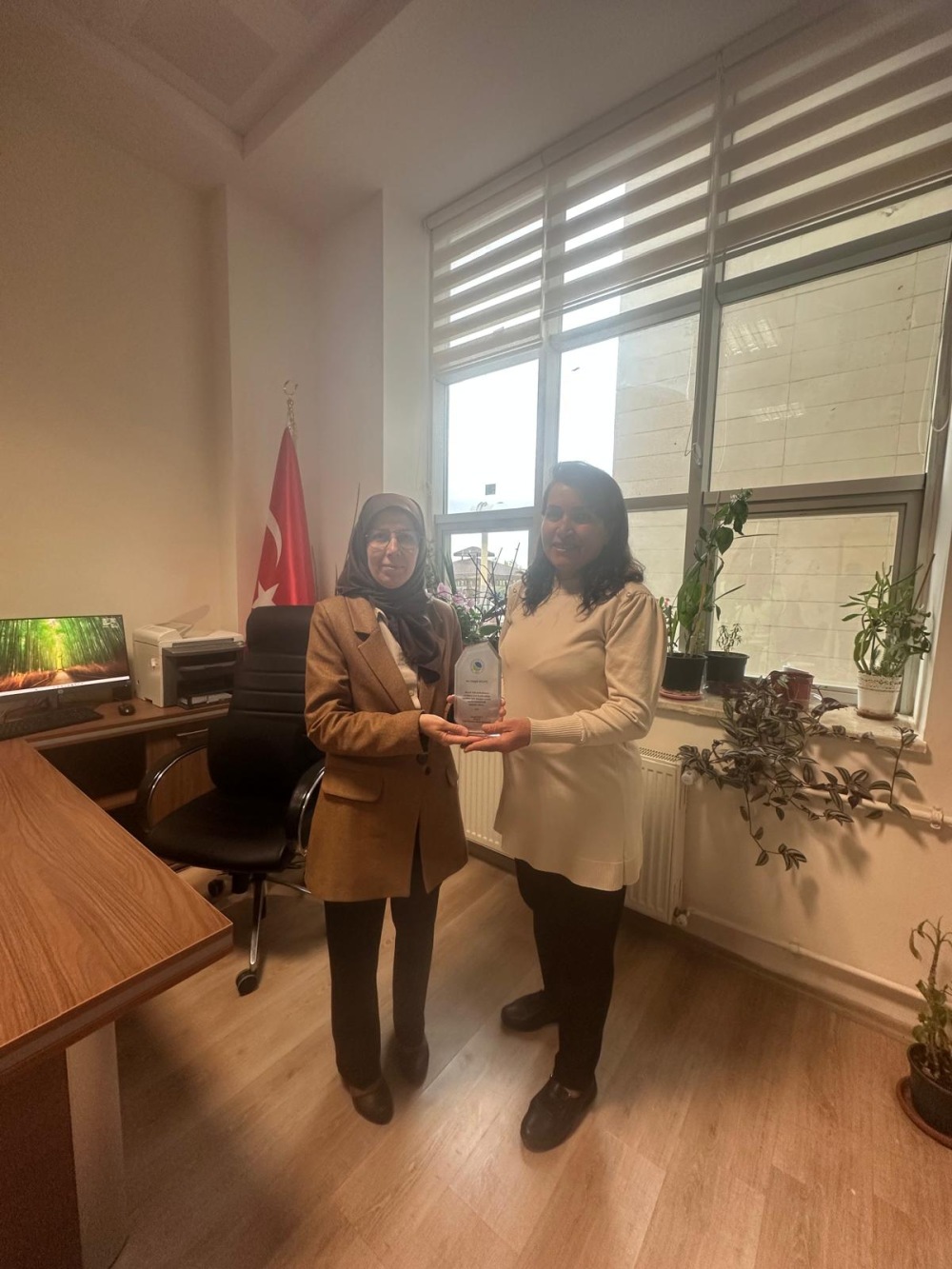 Duygu dolu anların yaşandığı bu günde Meslek Yüksekokulumuz Müdürü Dr. Öğr. Üyesi Ayşegül Turan, Güngör Kılınç'a plaket takdim etti.